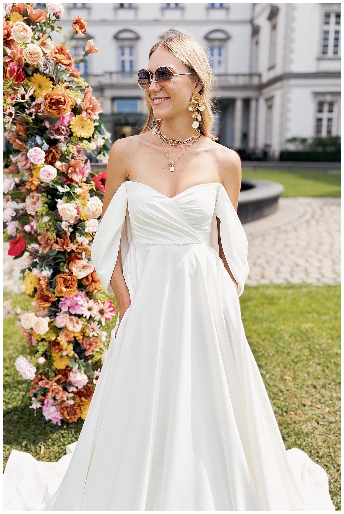 Das blonde Haar kunstvoll hochgesteckt und ihre Weiblichkeit in zeitloser Eleganz gehüllt sehnt eine Braut ihren First Look im stilvollen Ambiente herbei.