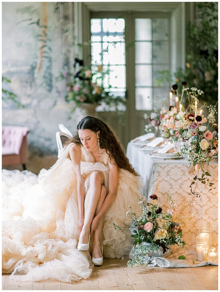 Romantische Schlosshochzeit im Garten in Pastellfarben Im barocken Gartensaal von Schloss Harmannsdorf entstand ein poetisches Hochzeitsshooting, das historische Malereien mit