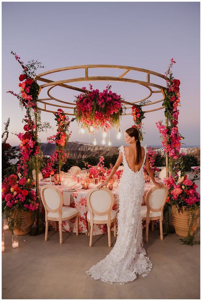 Pinke Hochzeit auf Santorini mit Meerblick Die Kulisse von Venetsanos Winery auf Santorini bildete den Rahmen für ein ausdrucksstarkes Hochzeitsshooting