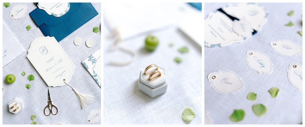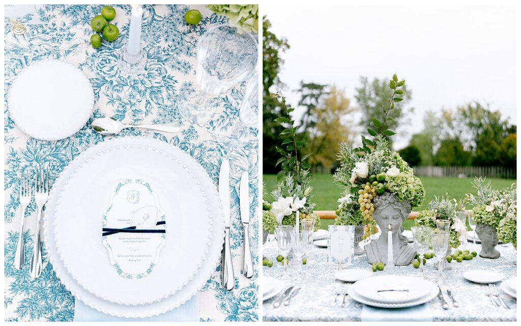 Im Mittelpunkt stand eine feine Farbpalette aus Blau, Weiß und zartem Grün. Die romantische Tischdecke im klassischen blau-weißen Muster griff den mediterranen Stil auf und setzte den Ton für das gesamte Design. Passend dazu wurde die Papeterie von Justlove Atelier in denselben Farben gestaltet. Feine Menü- und Platzkarten ergänzten das Arrangement und unterstrichen die ruhige, stilvolle Atmosphäre.