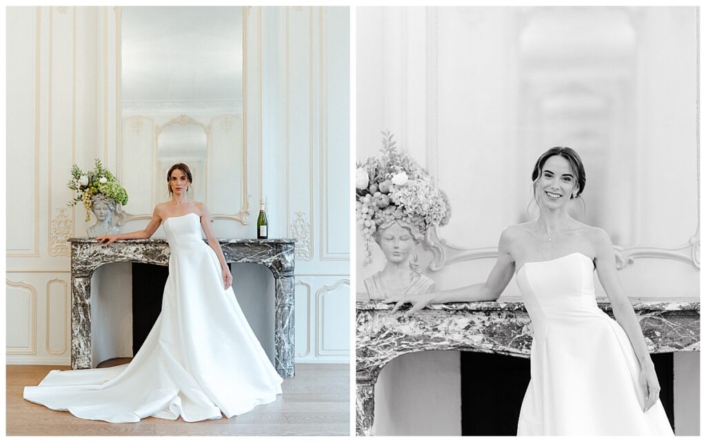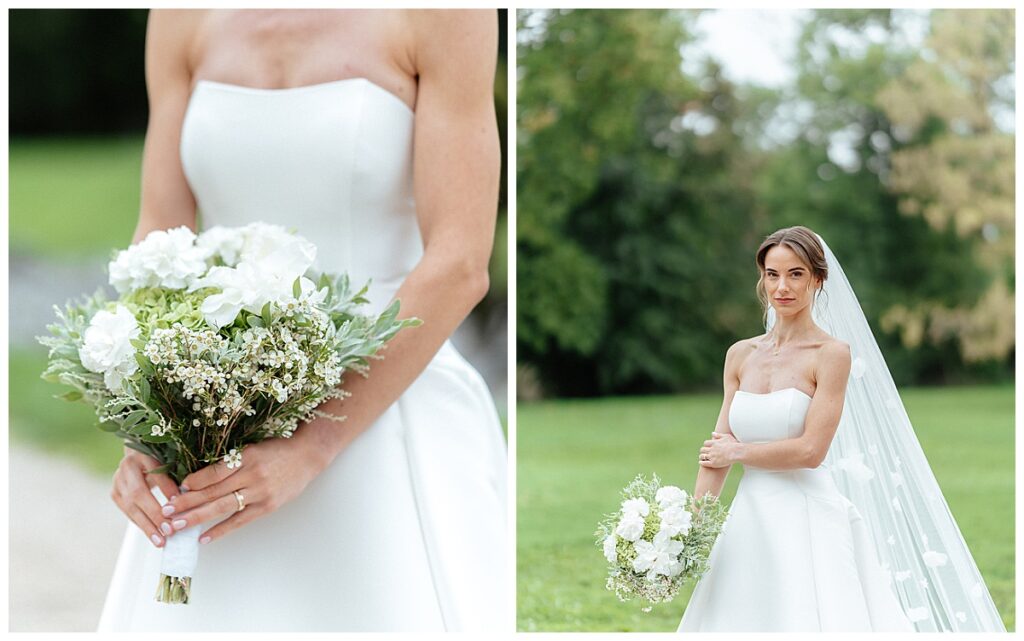 Auch der Brautlook fügte sich nahtlos in das Konzept ein. Die Braut trug ein schlichtes trägerloses Satin-Brautkleid mit elegantem Schleier von CréAnne. Die Haare waren modern zurückgebunden und unterstrichen den minimalistischen Stil. Der Brautstrauß bestand aus weißen Blüten mit hellgrünen Hortensien und spiegelte die Farbwelt der floralen Gestaltung wider. Am Abend wechselte die Braut in einen stilvollen Jumpsuit, der dem Editorial eine moderne Note verlieh, während der Bräutigam in einem klassischen schwarzen Smoking zeitlos elegant wirkte.