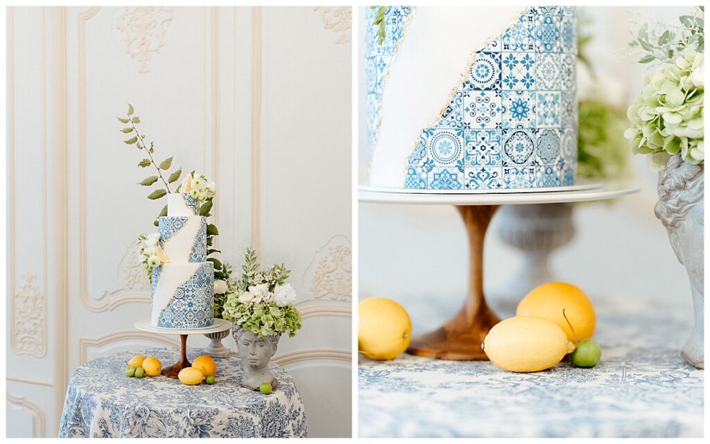 Ein besonderes Highlight bildete die Hochzeitstorte von Adopte un Cake. Sie kombinierte weiße Elemente mit blau-weiß gemusterten Flächen, inspiriert von mediterranen Keramikkacheln. Zitronengelbe Details und geometrische Formen griffen den Dolce Vita Gedanken auf und sorgten für einen frischen Farbakzent.