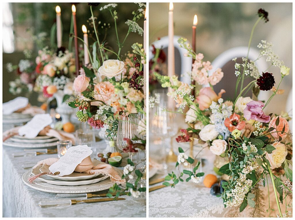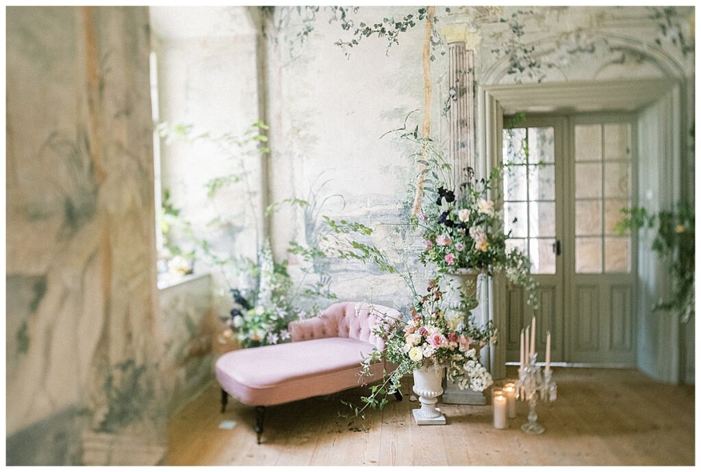 Ein zentrales Gestaltungselement war die Recamiere, die von Blumen umrahmt wurde und als stilvoller Ruhepunkt diente. Sie fügte sich harmonisch in die barocke Umgebung ein und unterstrich die Verbindung von Historie und Moderne. Auch der romantisch gedeckte Tisch spiegelte diese Idee wider. Zarte Blütenarrangements, Kerzen in verschiedenen Rosé Nuancen und feine Details sorgten für eine elegante Dinner Atmosphäre.
