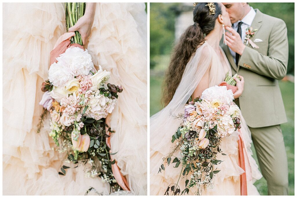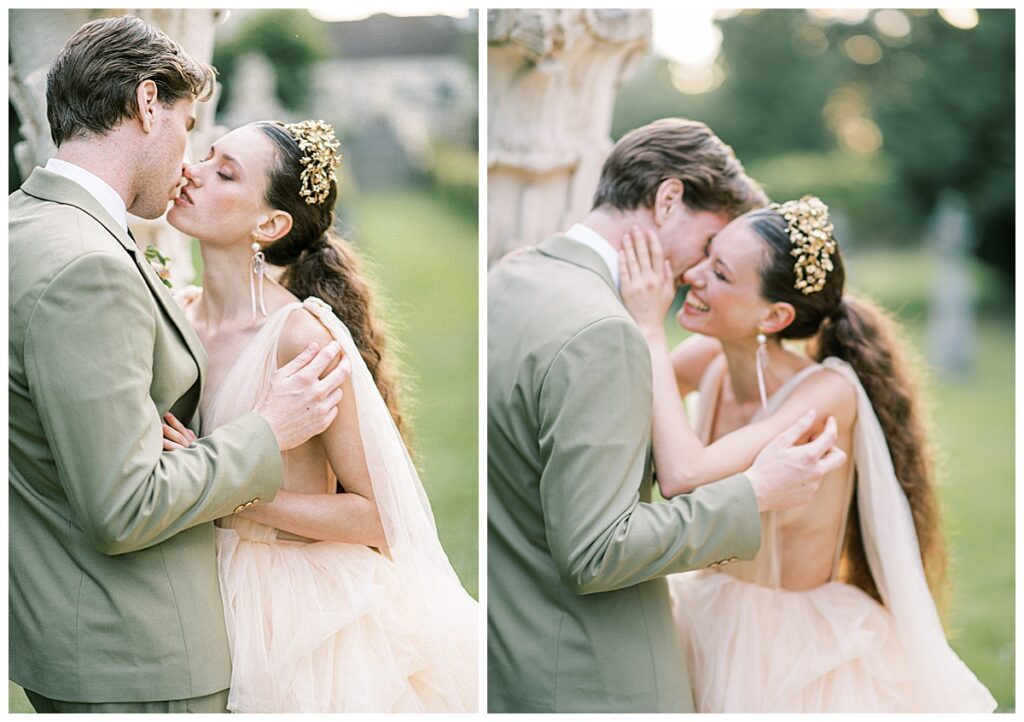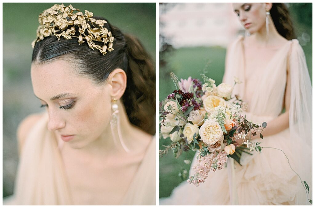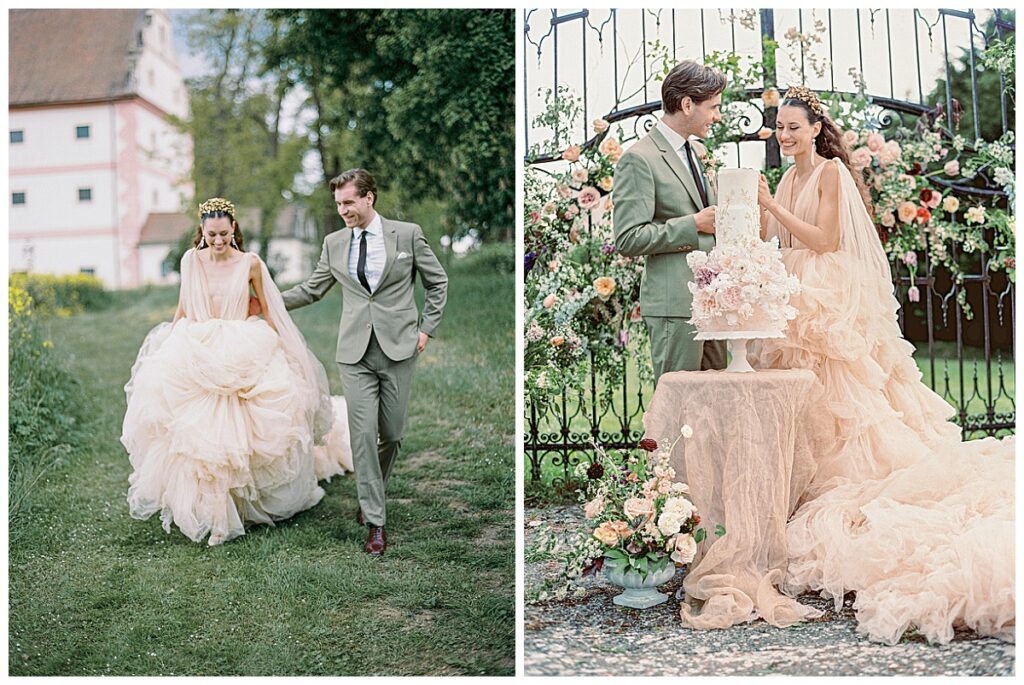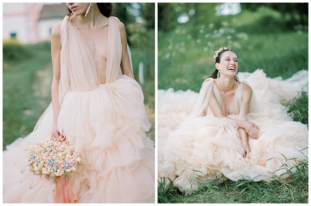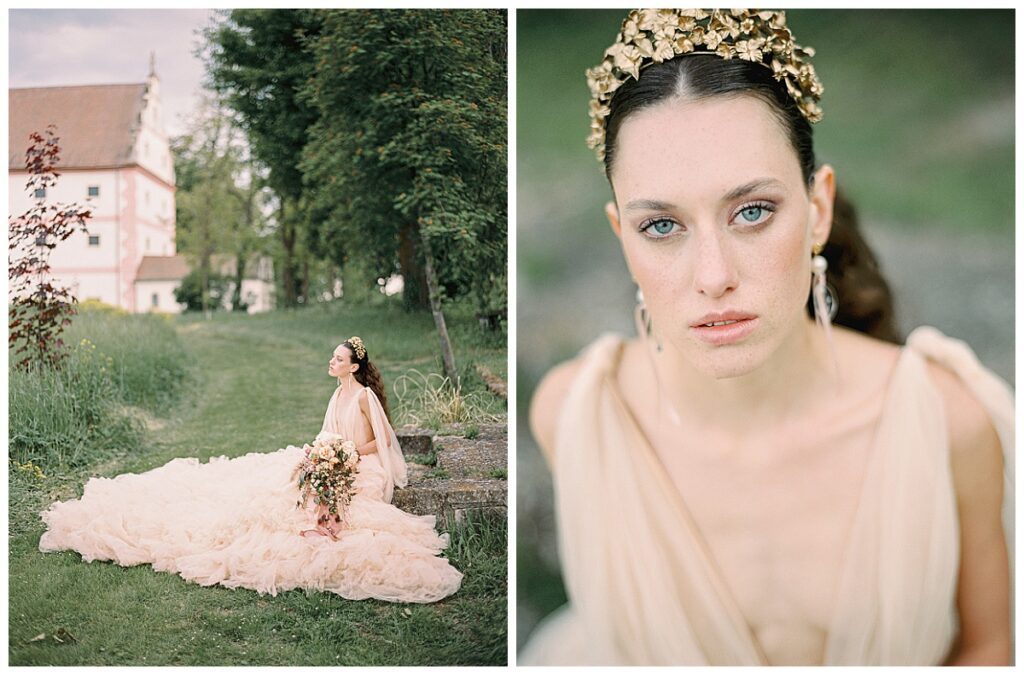 Ein besonderes Highlight war das voluminöse Brautkleid von Millia London. Das Modell Fiorella High Neck in einem soften Peach Ton mit üppiger Tüllschleppe verlieh der Szene eine romantische Leichtigkeit und setzte einen starken visuellen Akzent. Der zarte Nude Ton harmonierte mit den Pastellfarben der Blumen und unterstrich die märchenhafte Atmosphäre. Die Braut trug ihr Haar zu einem Zopf, ergänzt durch ein feines goldenes Headpiece mit filigranen Blüten, das den warmen Farbton des Kleides aufgriff.
