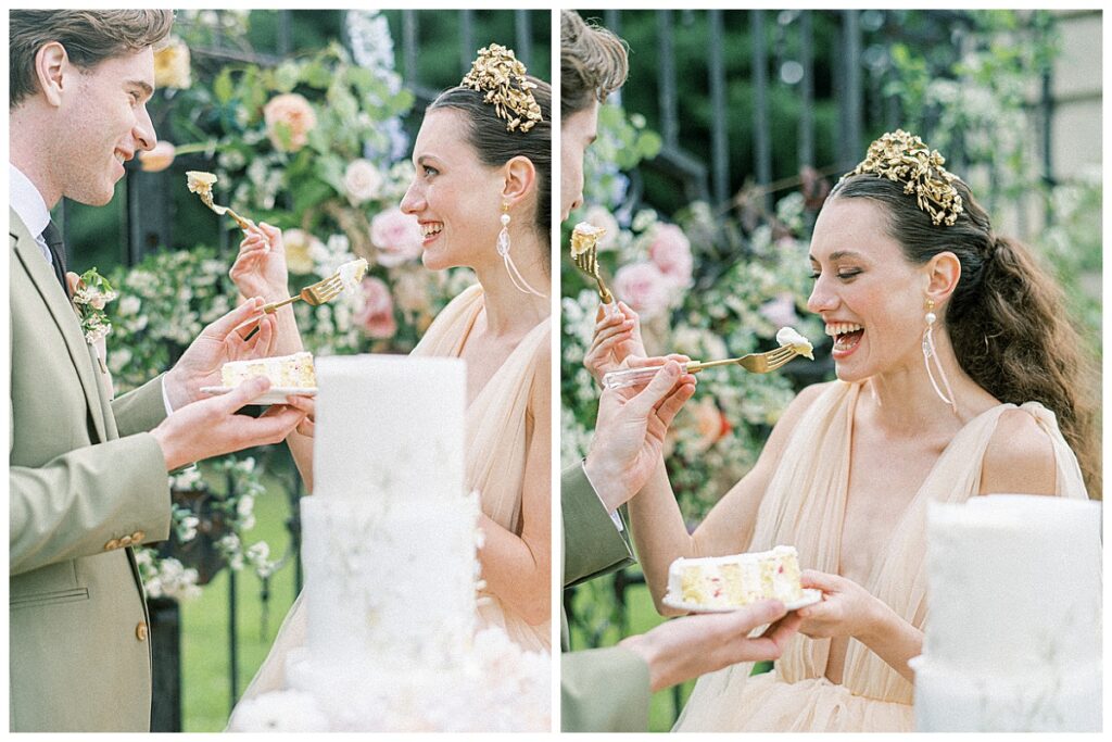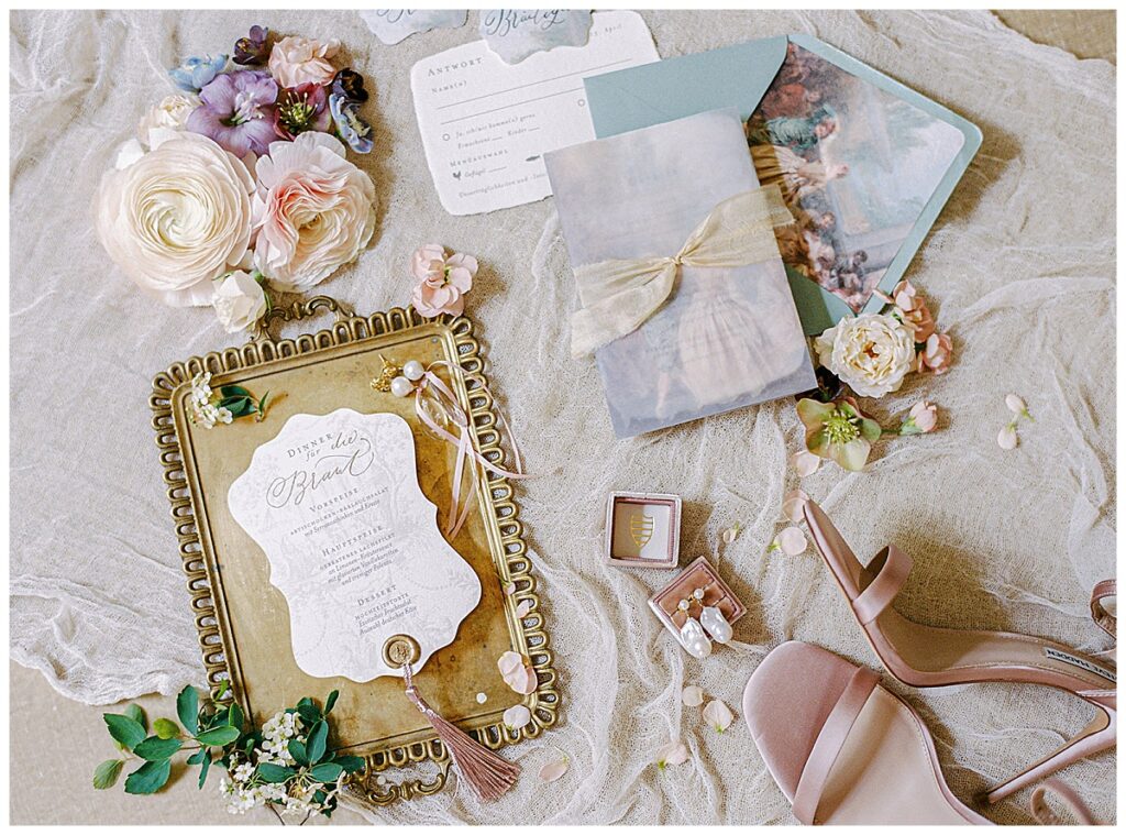 Die Papeterie von Bonjour Paper griff die Farbwelt des Shootings auf. Pastelltöne, kombiniert mit innen bedruckten blauen Briefumschlägen, setzten feine Akzente. Ergänzt wurde das Konzept durch eine kunstvolle Hochzeitstorte von Fine Cake Art. Mehrere Ebenen, dekoriert mit zarten roséfarbenen Blüten, passten perfekt zur floralen Gestaltung und rundeten das Gesamtbild harmonisch ab.