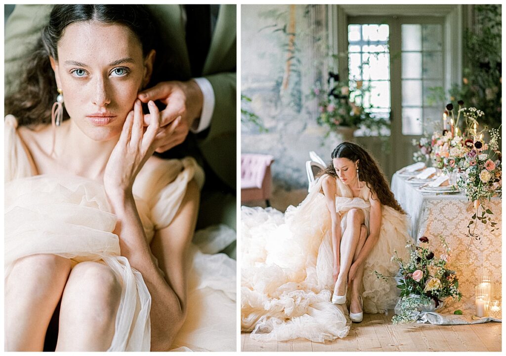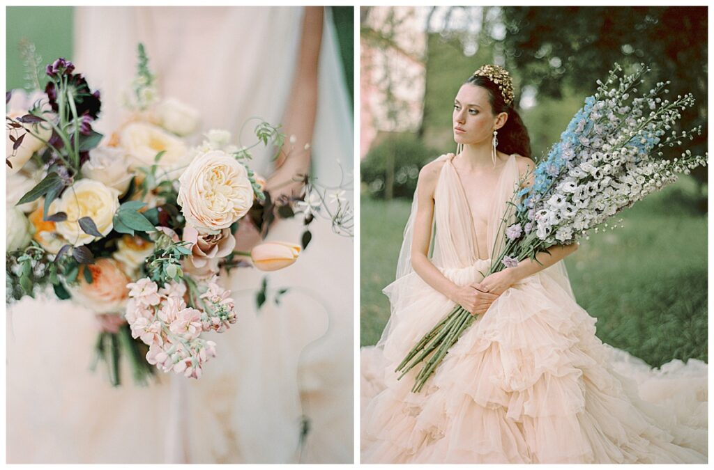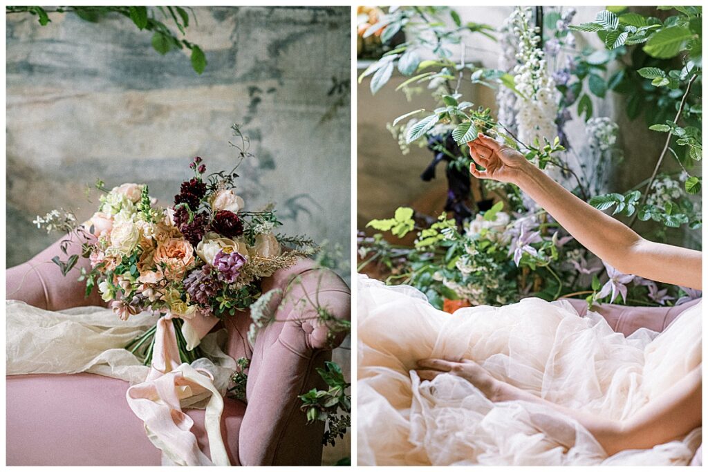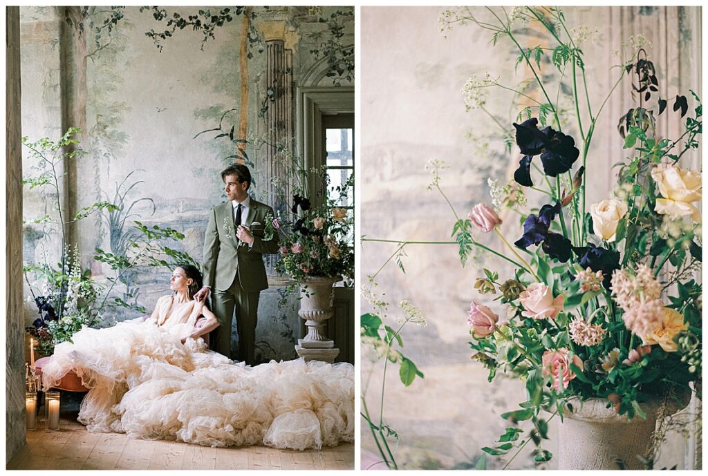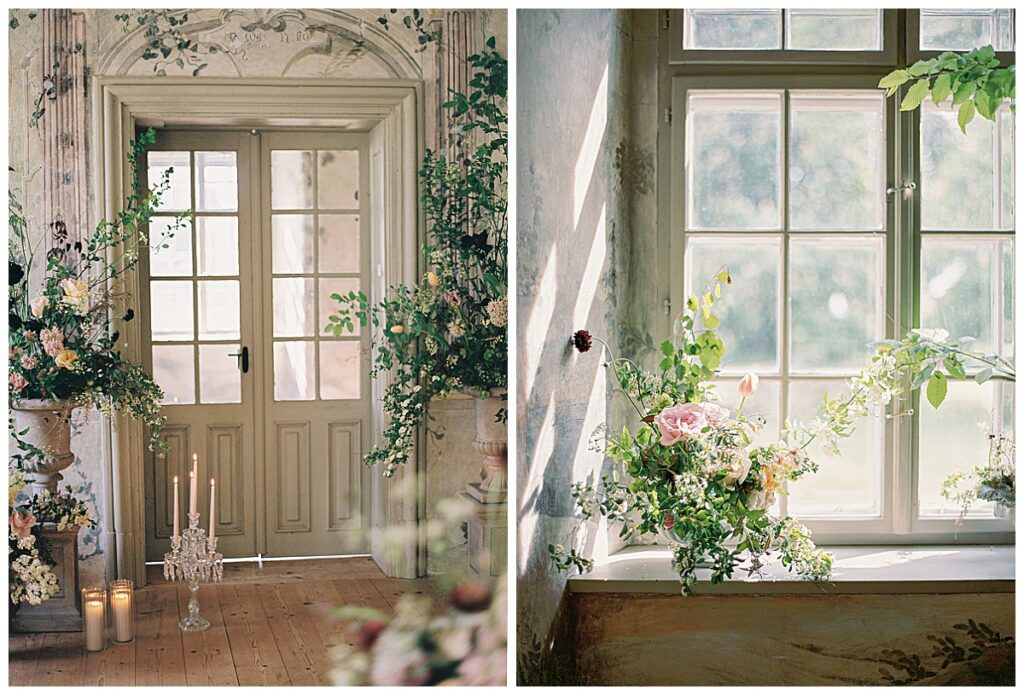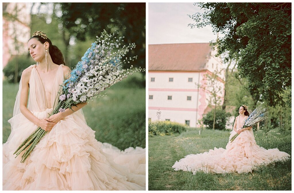Das gesamte Shooting verband die Geschichte des Gartensaals mit romantischen Hochzeitsgestaltung. Die üppigen, dennoch leichten Blumen, das voluminöse Pastellkleid und die kunstvollen Details erschufen eine zeitlose Szenerie, die den barocken Raum in ein lebendiges modernes Märchen verwandelte.